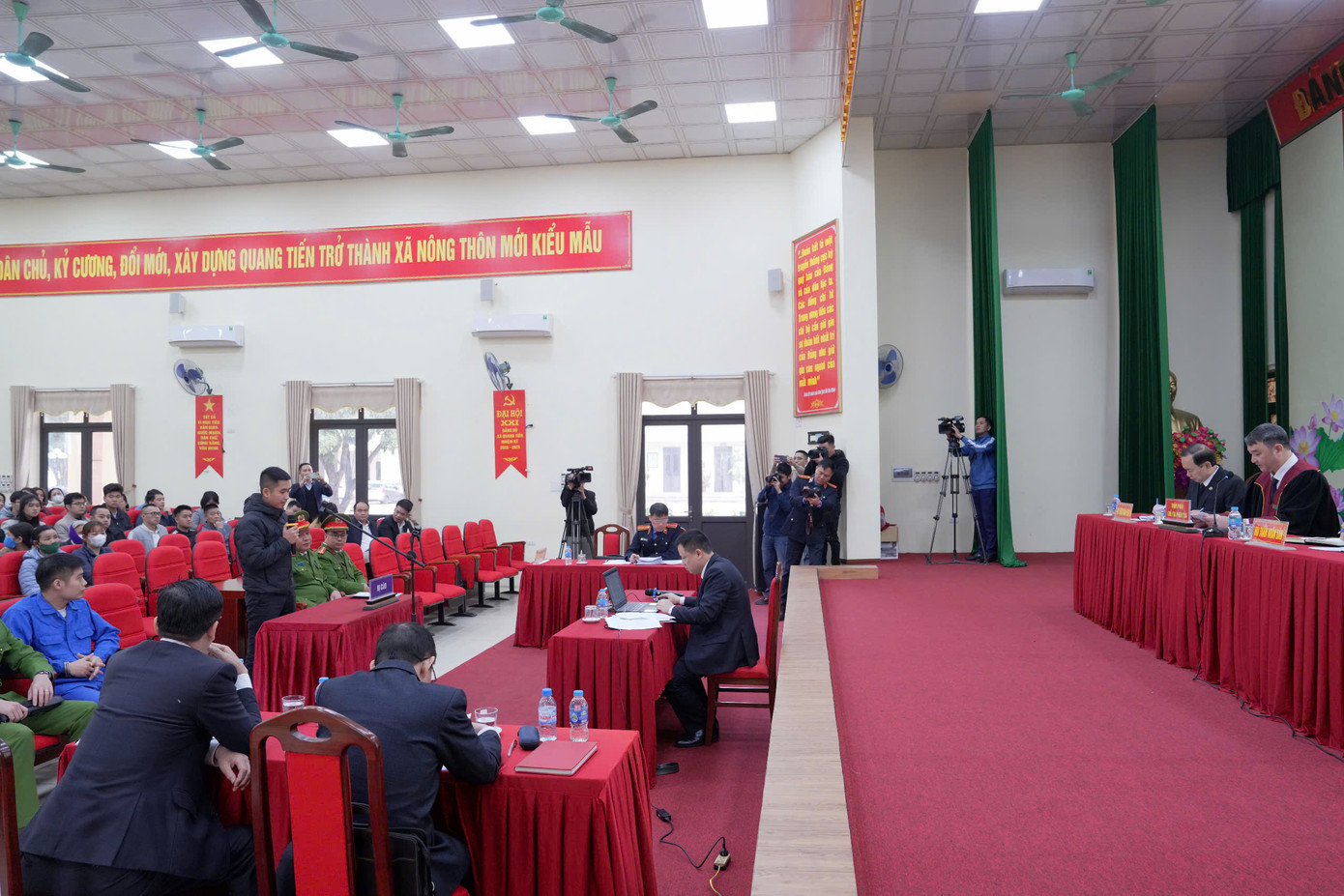 | Các bị cáo đứng nghe Viện kiểm sát công bố cáo trạng. |