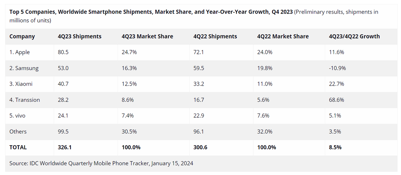 Số liệu nghiên cứu từ IDC cho thấy, trong quý IV/2023, có đến 40,7 triệu smartphone Xiaomi xuất xưởng trên toàn thế giới. Qua đó, hãng chiếm 12,5% thị phần, tăng trưởng đến 22,7% so với cùng kỳ năm 2022.