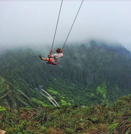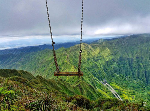 Chiếc xích đu được dựng sơ sài với hai thanh sắt gỉ và một sợi dây kim loại. Nó được đặt trên đỉnh một sườn núi trong dãy núi Koolau xanh mướt một màu, đem đến tầm nhìn từ trên cao ở phía đông đảo Oahu.