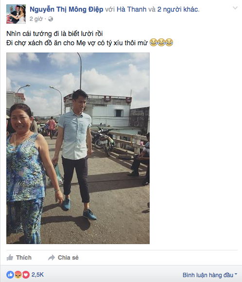 Mới đây, Kỳ Hân vừa đăng tải trên Facebook bức ảnh Mạc Hồng Quân xách đồ cho mẹ cô đi chợ tại quê nhà. Cô viết: "Nhìn cái tướng đi là biết lười rồi. Đi chợ xách đồ ăn cho mẹ vợ có tí xíu thôi mừ".