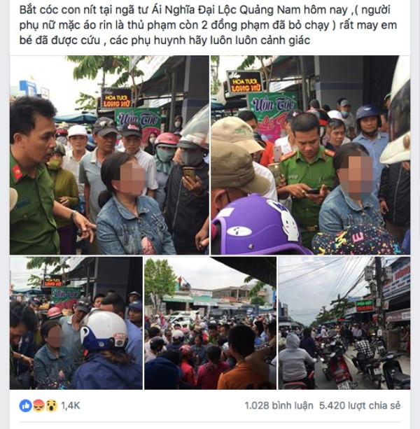 Trưa 3/11, tài khoản cá nhân T.L. đăng tải nhiều hình ảnh về một người phụ nữ lên mạng xã hội facebook cùng dòng trạng thái: “Bắt cóc con nít tại ngã tư Ái Nghĩa Đại Lộc Quảng Nam hôm nay ,( người phụ nữ mặc áo rin là thủ phạm còn 2 đồng phạm đã bỏ chạy ) rất may em bé đã được cứu , các phụ huynh hãy luôn luôn cảnh giác”.