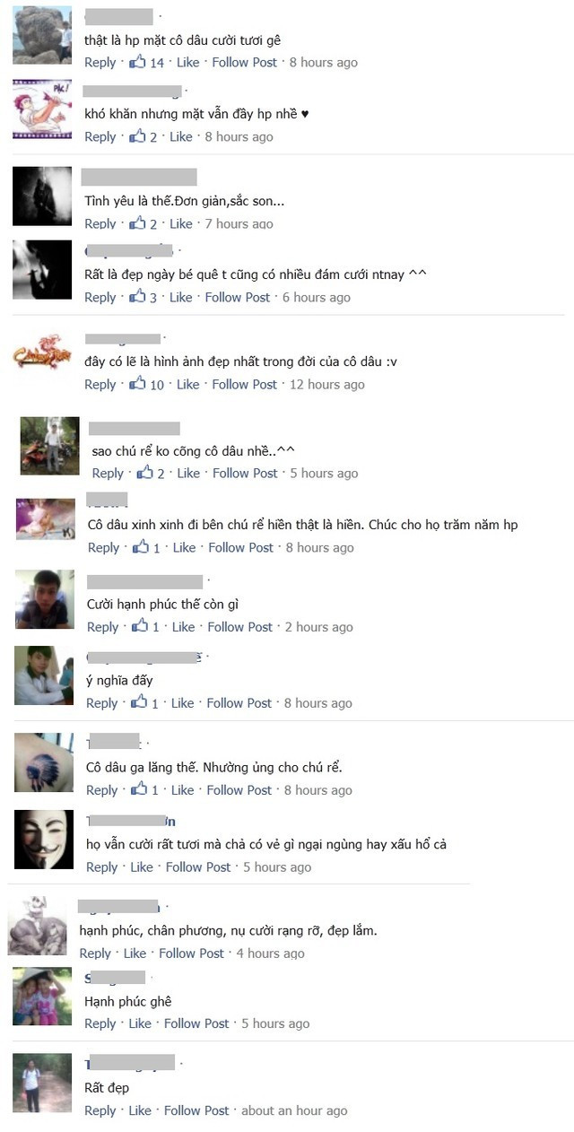 Một đám cưới giản dị, mộc mạc nhưng hạnh phúc khiến cộng đồng mạng không khỏi xúc động. "Một đám cưới hiếm có và một kỷ niệm sẽ không bao giờ quên trong cuộc đời cô dâu và chú rể", một dân mạng bình luận.