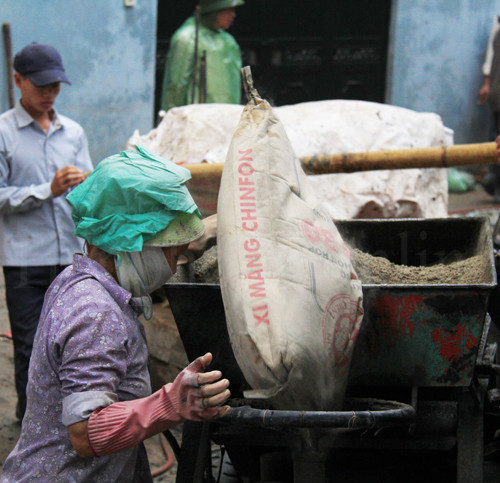 | Ngoài ra, các chị còn đội bê tông. Mỗi bao nặng 50kg. Ảnh: Trường Phong. |