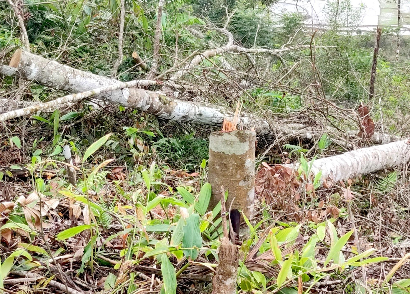 | | Những khoảnh rừng bị cắt hạ với diện tích rất lớn. Có 3 khu vực rừng bị lâm tặc chặt phá, ước tính hơn 1ha. | |