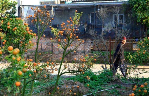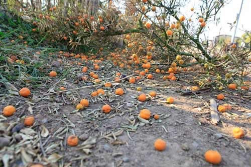 Đường vào làng quất Tứ Liên (Tây Hồ, Hà Nội) chất đầy cây quất khô, quả rụng vàng rực các gốc cây.