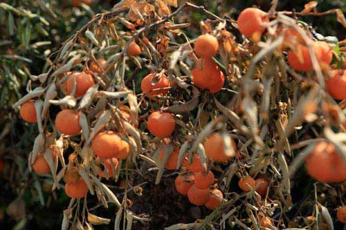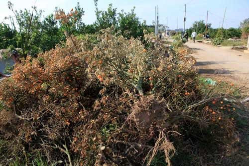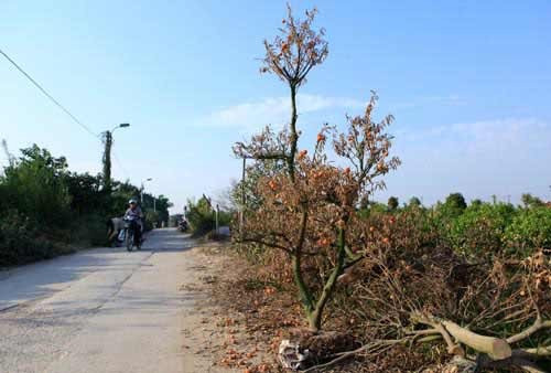 Một cây quất thế chết khô dựng ven đường. Hơn 20 làm nghề trồng quất, ông Nguyễn Văn Chính (50 tuổi, Tứ Liên) cho biết: “Tôi chưa từng thấy năm nào cây chết nhiều như năm nay. Gia đình tôi có khoảng 800 gốc thì 100 gốc đã hỏng và chặt bỏ, 300 gốc còn lại phải ngắt hết quả để cứu cây”.