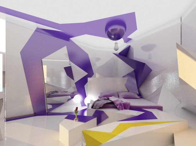 Với những căn phòng được thiết kế theo kiểu lập thể, đòi hỏi chủ nhân phải là người có cá tính mạnh và ưa khám phá. Kết hợp tone màu tím và trắng nhẹ nhàng nhưng nổi bật, giúp bạn thay đổi cách nhìn về các gam màu trung tính.