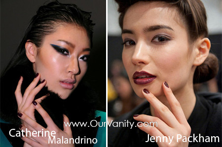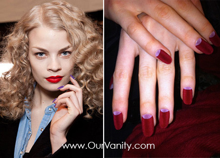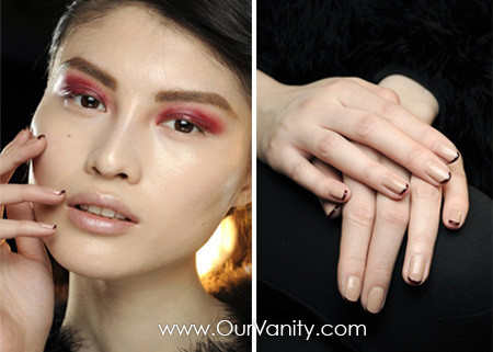 Móng tay metallic vẫn sẽ là xu hướng được ưa chuộng mùa Thu Đông tới. Hình oval hay móng hình tròn tự nhiên liên tục được bắt gặp trên các sàn diễn. Màu nhung đỏ là một điểm nhấn trong show của Ruffian, được thiết kế bởi MAC.