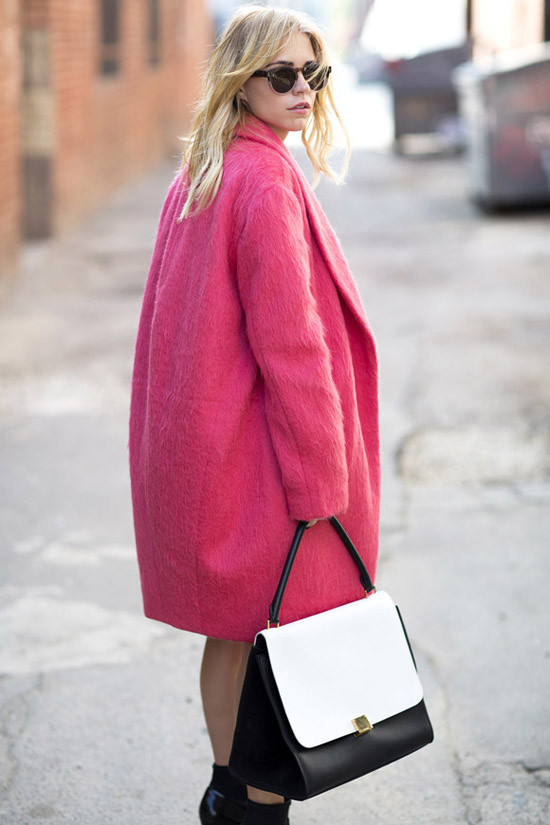 Tông màu hồng đậm khó mix đồ hơn một chút. Vì vậy bạn nên phối chiếc áo khoác màu hồng đậm của mình với những item khác có màu đen hoặc trắng để không tự biến mình thành cô nàng điệu đà thái quá.