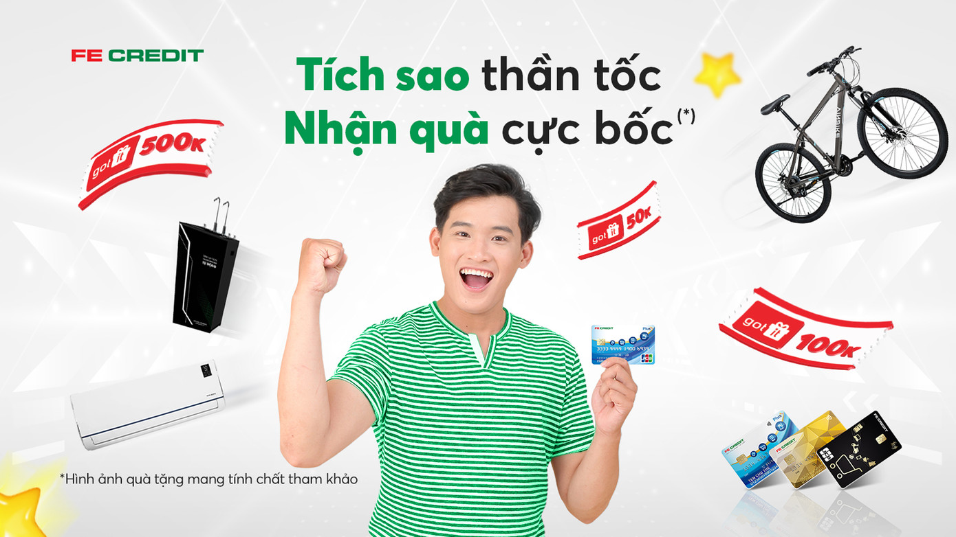 Đồng thời, từ nay đến hết 30/6/2023, với mỗi giao dịch thanh toán, chi tiêu, mua sắm thành công trên thẻ tín dụng FE CREDIT, chủ thẻ sẽ nhận được số Sao tương ứng với tổng số tiền đã chi tiêu (10.000 đồng sẽ quy đổi được 1 Sao). Số Sao tích lũy để quy đổi thành nhiều phần quà hấp dẫn như Máy lạnh, máy lọc nước, xe đạp, voucher mua sắm Got It…