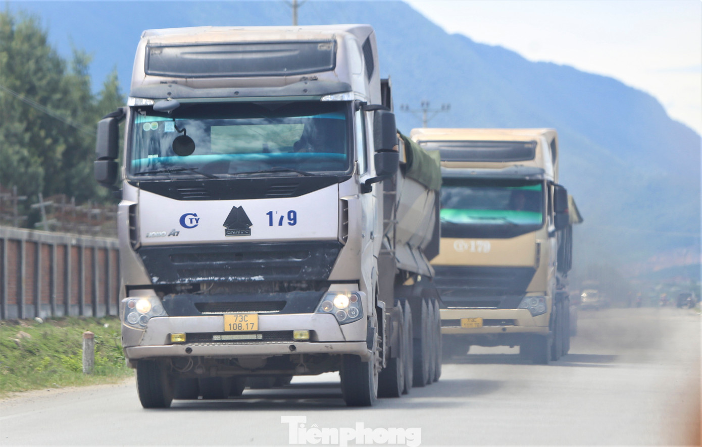 Tuy nhiên, vào sáng cùng ngày, phóng viên ghi nhận hàng trăm lượt xe tải, xe ben, xe Howo chở cát, đất, đá nối đuôi nhau chạy rầm rầm trên các tuyến đường về khu kinh tế Vũng Áng.