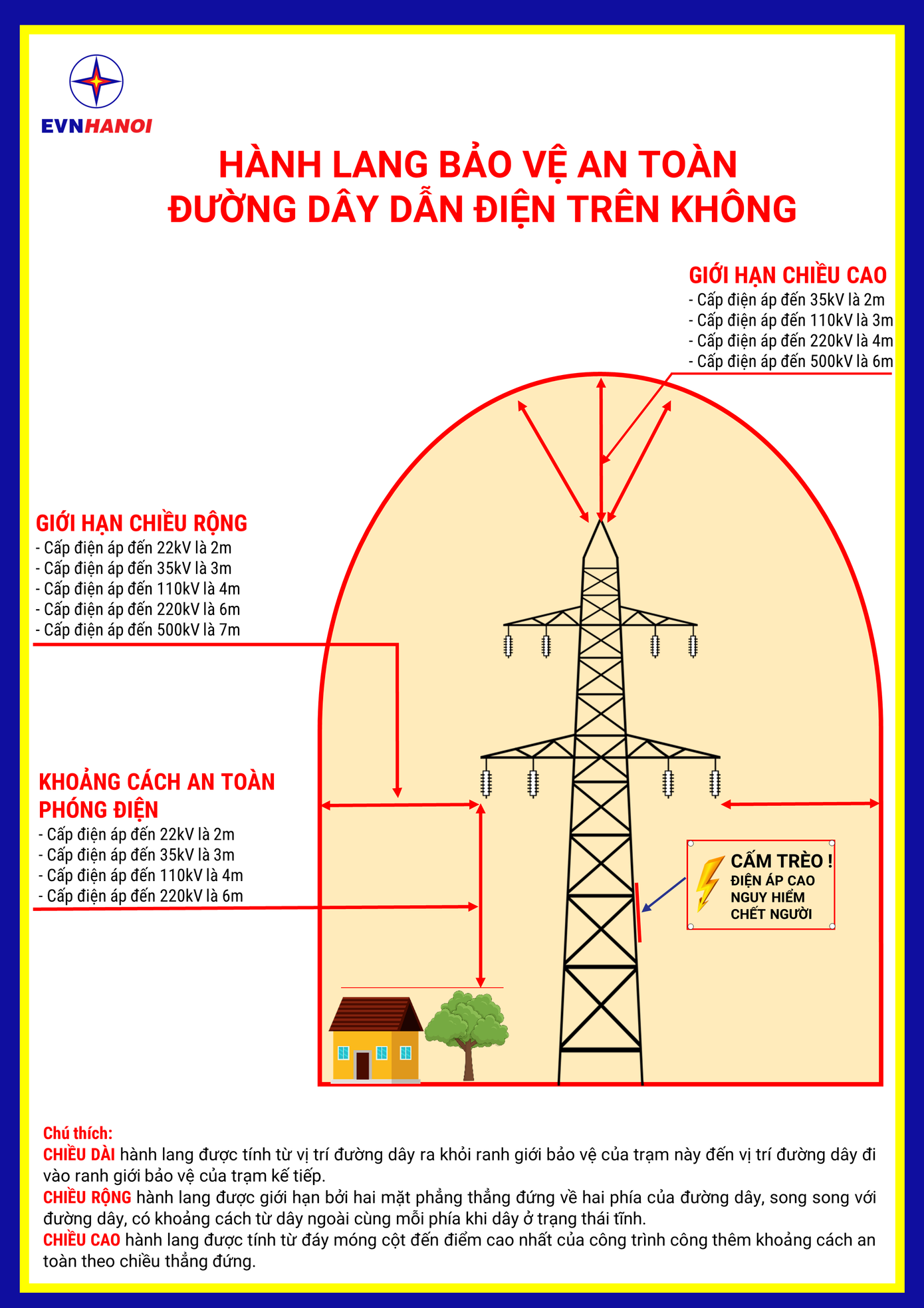 Để công tác bảo vệ hành lang an toàn lưới điện ngày càng hiệu quả, tránh xảy ra sự cố, gây thiệt hại cho lưới điện cũng như ngăn chặn nguy cơ xảy ra tai nạn đối với con người. EVNHANOI khuyến cáo các công trình, dự án xây dựng ngay từ khi lập các dự án, thiết kế cần phải khảo sát kỹ các nội, dự toán kinh phí cho công tác giải phóng hành lang an toàn lưới điện theo đúng Luật Điện lực.
