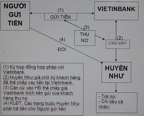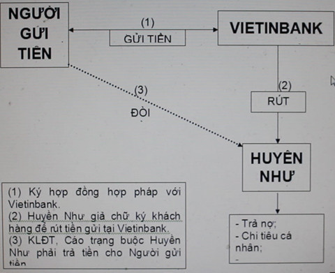 Thứ bảy, Huyền Như tự ý trích tiền trên tài khoản hợp pháp của khách hàng để lập sổ tiết kiệm mang tên khách hàng, sau đó nhờ người đứng tên hồ sơ vay giả, giả chữ ký khách hàng, sử dụng trái phép tiền gửi này cầm cố vay vốn tại Ngân hàng Công thương, sau đó, Ngân hàng Công thương tự ý trích tiền gửi của khách hàng để thu nợ đã cho vay trái pháp luật.