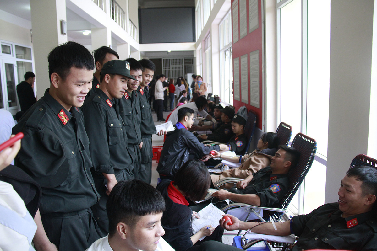 Đến cuối giờ trưa, còn hàng trăm đoàn viên, thanh niên chờ đến lượt hiến máu. Trong ảnh là các cán bộ, chiến sĩ cơ động thuộc Tiểu đoàn Cảnh sát cơ động số 4 - Trung đoàn cảnh sát cơ động Bắc Trung bộ chờ đến lượt hiến máu.