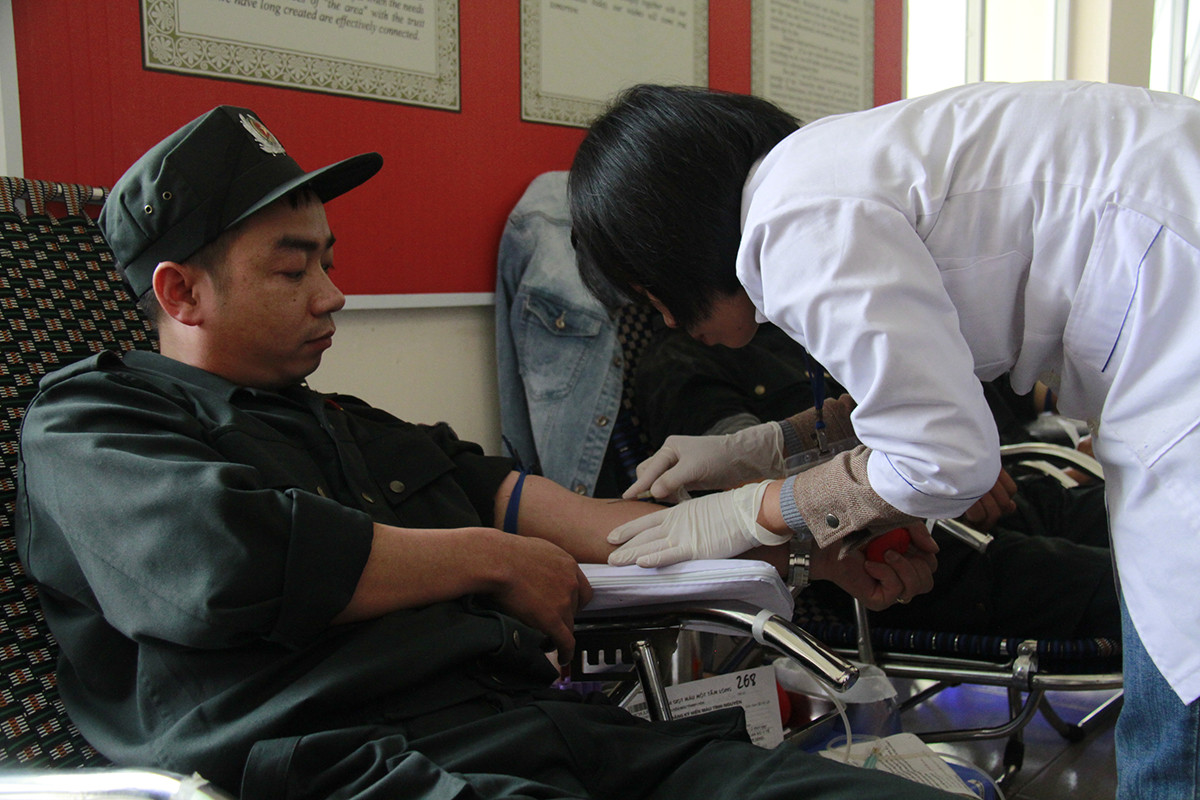 Một chiến sĩ cảnh sát cơ động thuộc tiểu đoàn cảnh sát cơ động số 4 -Trung đoàn cảnh sát cơ động Bắc Trung Bộ (Bộ Tư lệnh Cảnh sát cơ động Bộ Công an) tham gia hiến máu