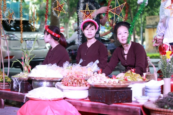 Những người phụ nữ ăn mặc trang phục truyền thống tại các gian hàng