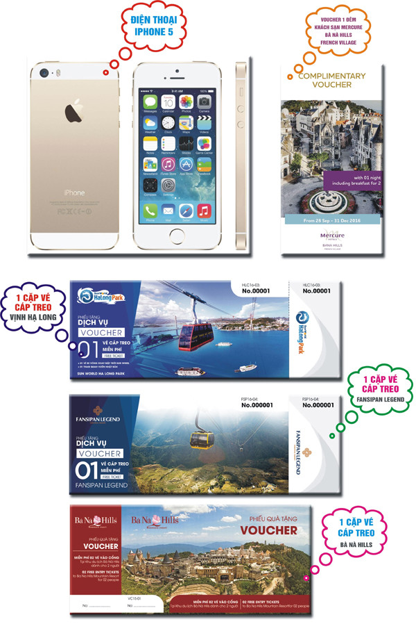 2- 1 cặp vé cáp treo của khu du lịch Bà Nà Hills - Hệ thống cáp treo gồm 201 cabin với công suất 3.000 khách/ giờ và 1 voucher nghĩ 1 đêm dành cho 2 người tại khách sạn Mercure Bà Nà Hills French Village - Nằm trong hệ thống khách sạn 4 sao do tập đoàn Accor Hotel quản lý, khách sạn Mercure Bà Nà Hills French Village sẽ mang đến cho du khách không gian sống tiện nghi và lãng mạn theo phong cách Pháp cổ.