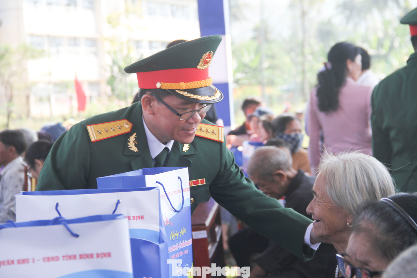 | Đại tá Lương Đình Chung - Phó Chính ủy Quân khu 5 tặng quà cho bà con nhân dân. (Ảnh: Trương Định) |