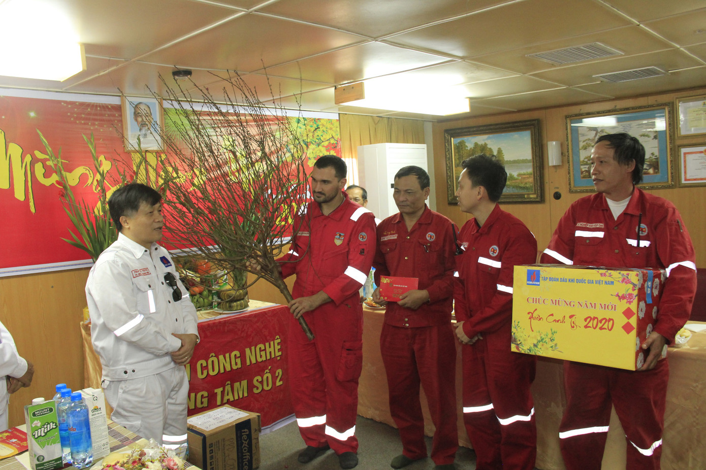 Cũng trong những ngày này, lãnh đạo Tập đoàn Dầu khí Việt Nam (PVN) luôn dành thời gian cho những chuyến công tác để kiểm tra tình hình, làm việc, thăm, chúc Tết cán bộ, kỹ sư, người lao động dầu khí trên những công trình biển với một sự quan tâm đặc biệt. Năm nay cũng vậy, từ đất liền, đoàn công tác của PVN đã đến thăm và chúc Tết các CBCNV, người lao động đang làm việc trên giàn CNTT số 2, mang theo tấm lòng gửi gắm trong những nhành hoa mai, hoa đào, đem sắc xuân ra góp vui với người lao động.