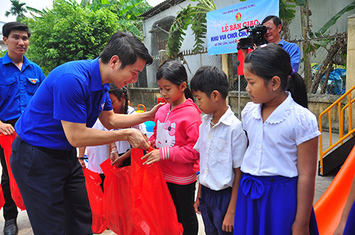 Hội đồng Đội Trung ương bàn giao sân chơi cho thiếu nhi Bên cạnh đó, Đoàn công tác Trung ương Đoàn, Hội đồng Đội Trung ương còn khánh thành điểm sinh hoạt, vui chơi cho thiếu nhi và trao 10 phần quà cho học sinh có hoàn cảnh khó khăn ở xã Phú Cần, huyện Tiểu Cần với tổng giá trị gần 145 triệu đồng.