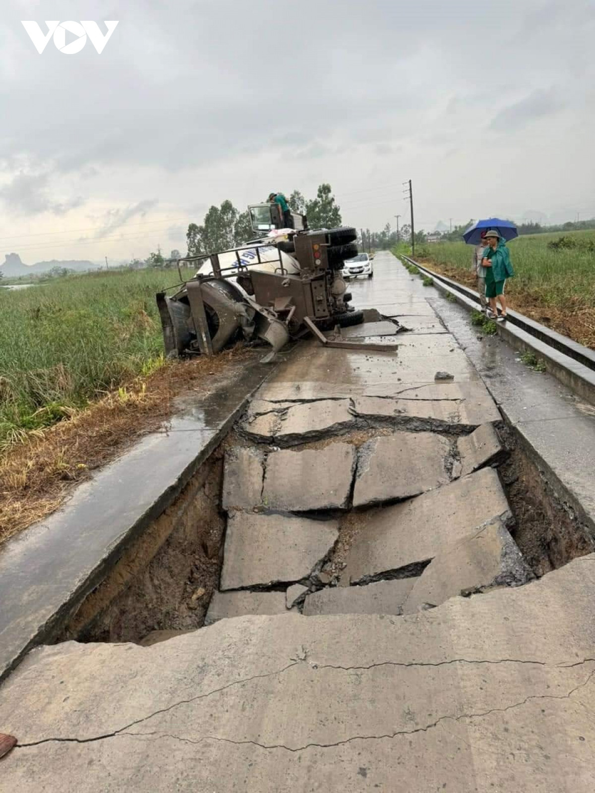 Bước đầu, nguyên nhân sụt lún xác định phần đất đường dưới lớp bê tông mặt bị rỗng kết hợp xe tải trọng nặng dẫn đến sụt đường gây đổ xe.