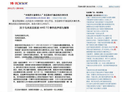 Diễn đàn trực tuyến Boxun (Trung Quốc) đã cho đăng tải bức thư nặc danh được gửi tới một nhà báo có tiếng ở Trung Quốc, có đầu đề “Thanh minh và giải thích về sự kiện chuyến bay MH370 của hãng hàng không Malaysia Airlines”.