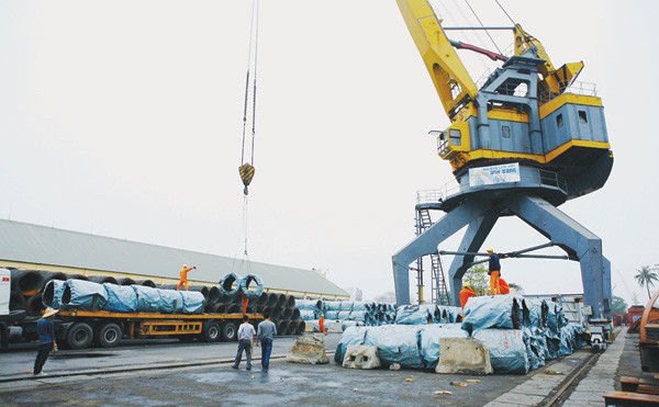 Cảng Hoàng Diệu thuộc Công ty TNHH MTV cảng Hải Phòng chiều 6/2 (chiều mồng 7 tết Giáp Ngọ), những đống hàng thép cuộn, thép xây dựng chất cao như núi.