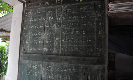 Câu nói “Thua thầy một vạn không bằng kém bạn nửa li” được ông Giao ghi lên tường trước sân nhà để nhắc các cháu phải cố gắng học hành. Ảnh: Văn Chung (VietNamNet)