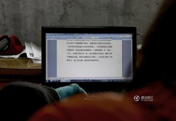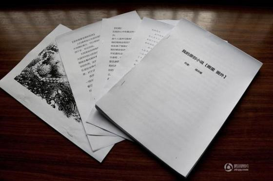 Hu nói rằng mỗi phút cô gõ được khoảng 20 đến 30 từ. Trong ảnh, bố Hu đưa tập bản thảo truyện tiểu thuyết mà con gái viết bằng chân cho các phóng viên.