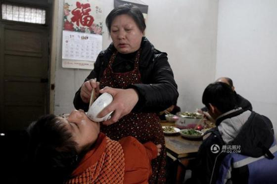 Khi lớn lên, Hu bắt đầu học cách tự làm các công việc trong ngày bằng chân, do cô chỉ có thể cử động được đầu và bàn chân. Trong ảnh, mẹ Hu giúp cô khi cả nhà cùng ăn tối.