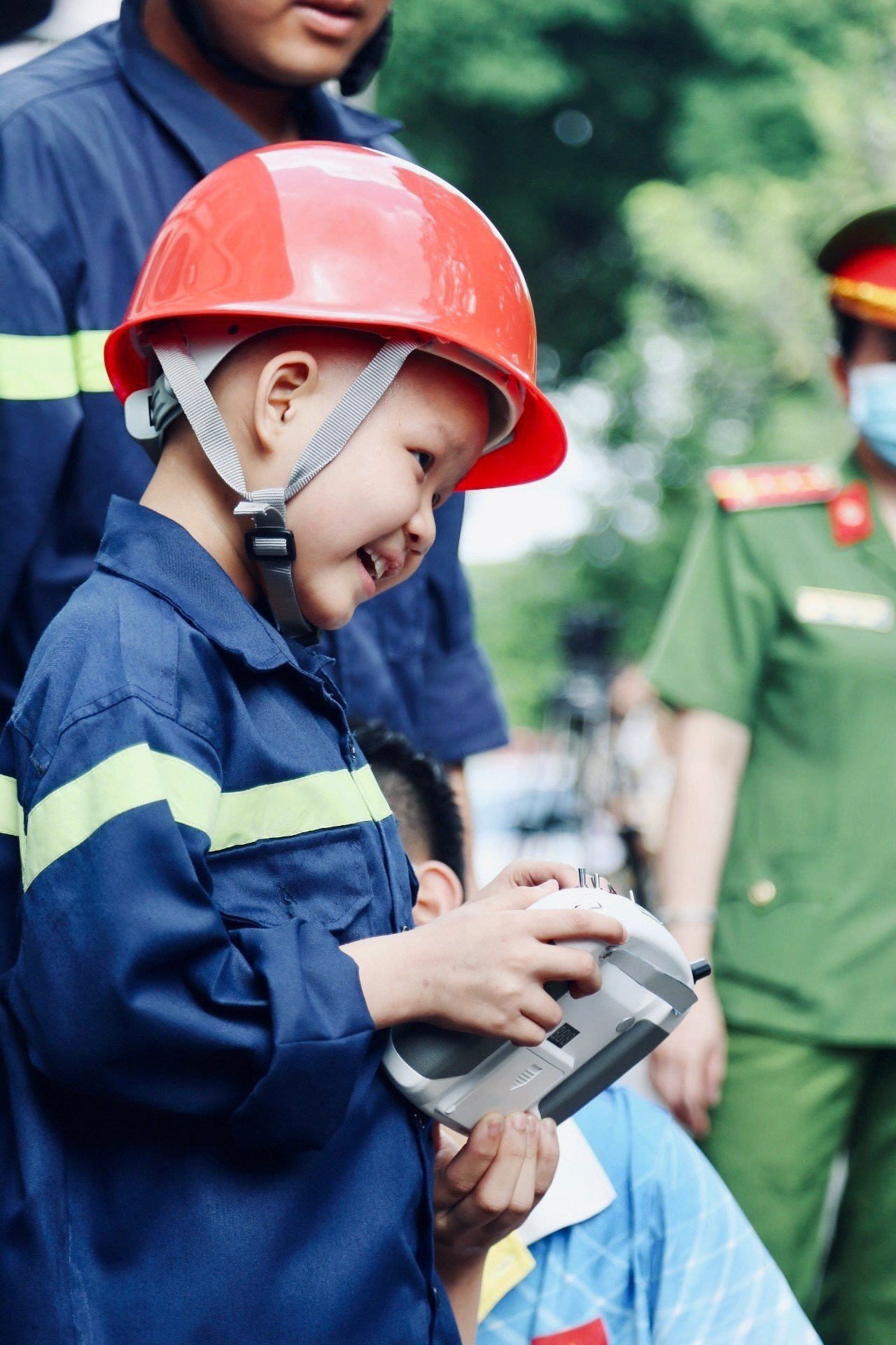 Sau khi được các chiến sĩ cảnh sát PCCC hướng dẫn và cùng thực hiện nhiệm vụ diễn tập chữa cháy, nụ cười luôn rạng ngời trên khuôn mặt của Quân. “Hôm nay con vui lắm, ước gì sau này con cũng trở thành một cảnh sát PCCC…" - Quân nói.