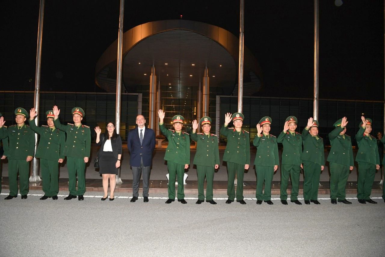 | Lãnh đạo Bộ Quốc phòng và các thủ trưởng đơn vị có quân nhân lên đường tới Thổ Nhĩ Kỳ tham gia hỗ trợ công tác cứu hộ cứu nạn chào tạm biệt đoàn công tác. Ảnh: Phú Sơn |