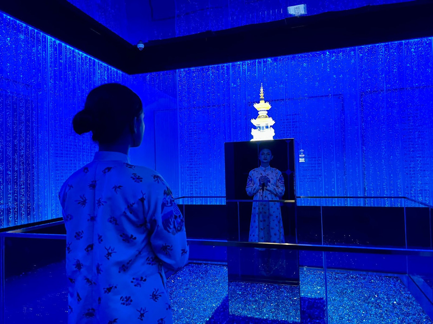Từ những cánh sen dưới chân tượng Phật Bà Tây Bổ Đà Sơn, những thác nước đổ xuống thanh khiết. Với nhiều người, dòng nước như hiện thân cho sự lan tỏa của từ bi của Bồ Tát phổ độ cho chúng sanh.