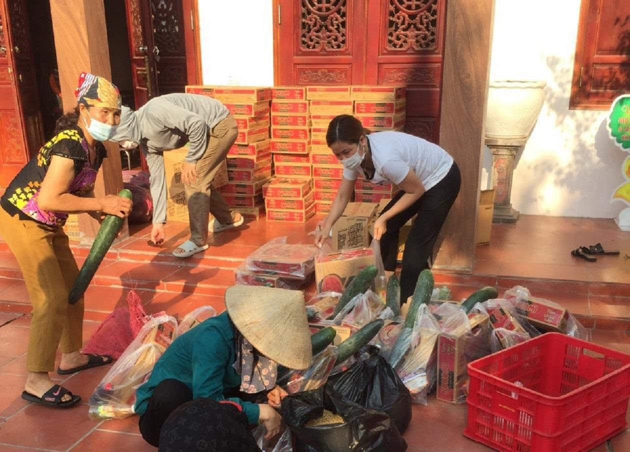 | Thành viên Hội phụ nữ huyện Quế Võ chia gạo, thực phẩm để chuẩn bị phân phát cho công nhân, người dân ở những nơi bị phong tỏa. |