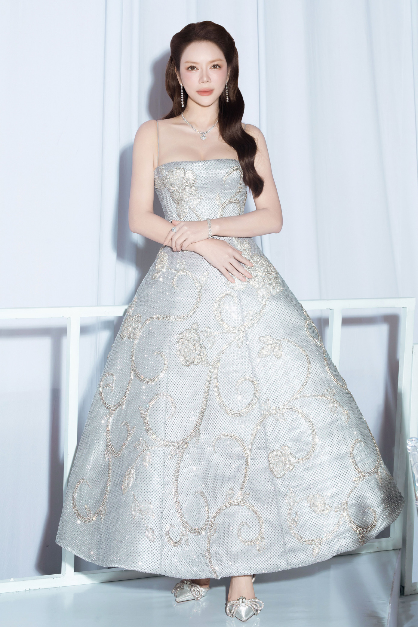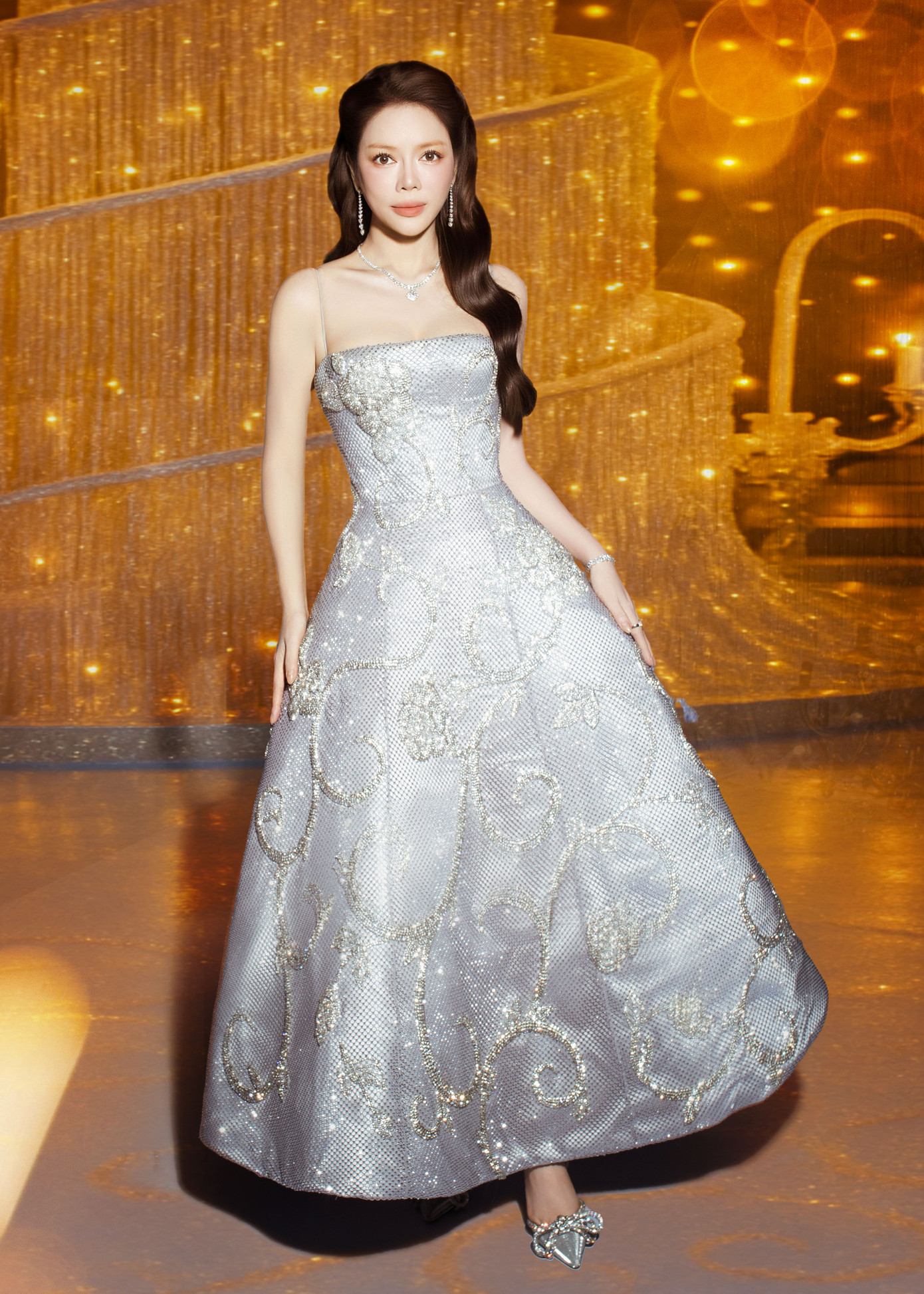 Lý Nhã Kỳ chọn cho mình một thiết kế đầm dạ hội tinh xảo, thể hiện rõ nét phong cách couture đặc trưng của Chung Thanh Phong. Bộ đầm với phần corset ôm sát thân trên giúp tôn lên vòng eo thon gọn và đường cong quyến rũ của người đẹp. Phần chân váy xòe chữ A bồng bềnh, tạo nên sự bay bổng và lộng lẫy, biến Lý Nhã Kỳ thành tâm điểm của sự kiện.