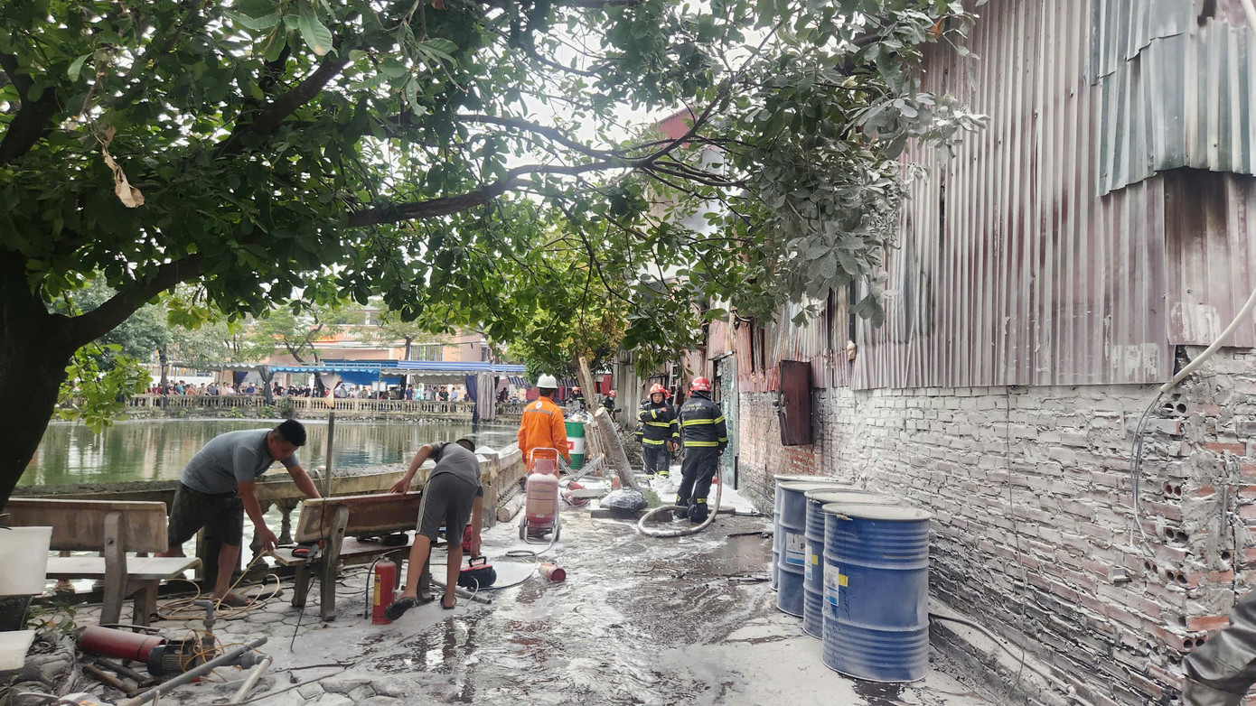 Người dân xung quanh cùng lực lượng PCCC cơ sở dùng nước, bình cứu hỏa chữa cháy nhưng bất thành.
