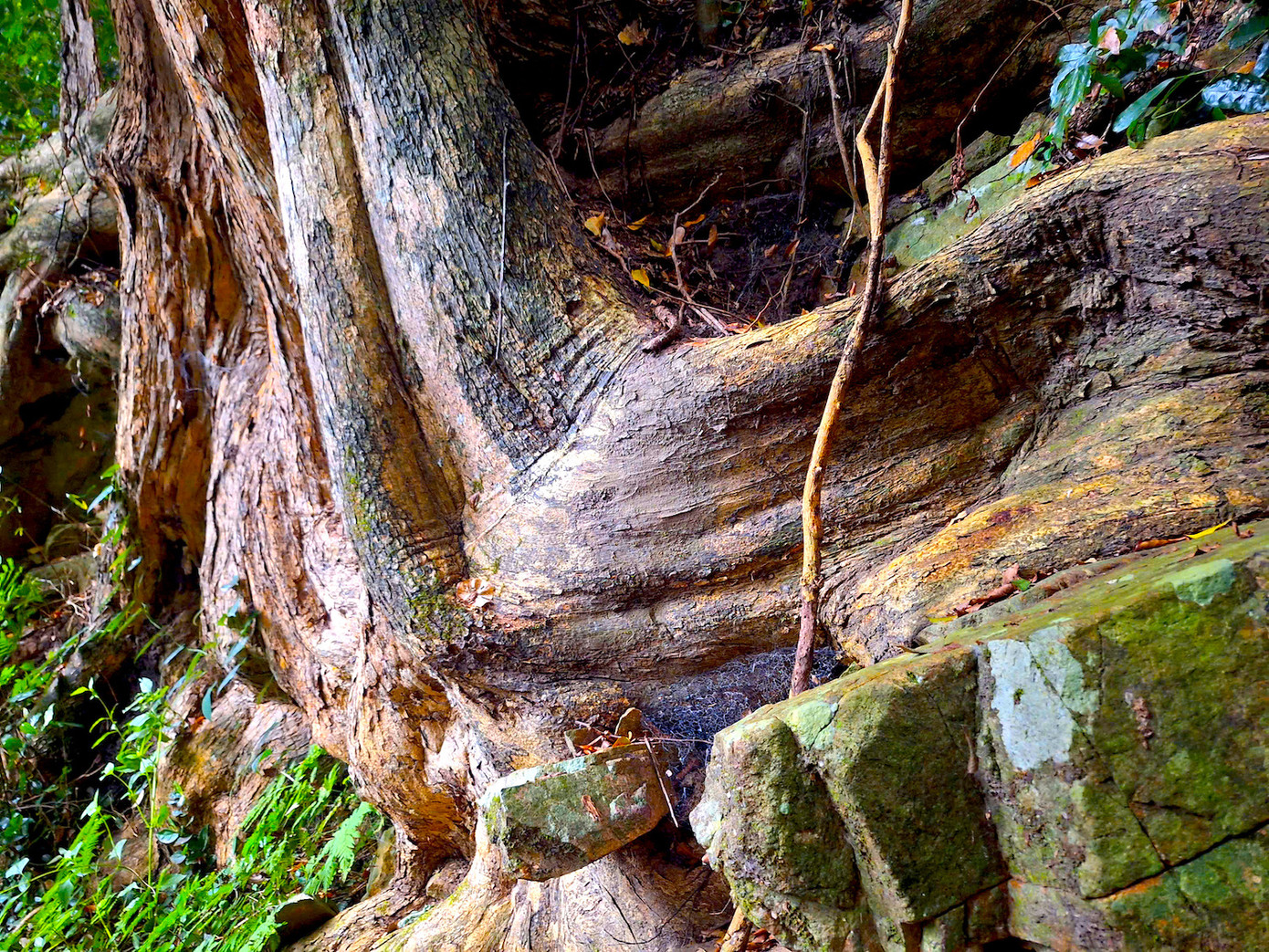 | Phần rễ của cây giáng hương cuồn cuộn, ôm những tảng đá lớn. |