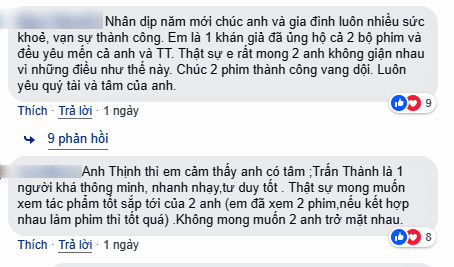 Trước diễn biến ngày càng kịch tính của câu chuyện trên, nhiều ý kiến trái chiều từ người hâm mộ liên tục xuất hiện. Một người viết: “Trấn Thành quý mến! Dịp tết này được ghi nhận như một điểm son cho sự nghiệp của bạn khi 2 bộ phim bạn tham gia đều thắng lớn...Chúc mừng và chúc bạn luôn luôn và tiếp tục gặt hái thành công, được Thượng đế và Tổ nghiệp phù hộ...Tuy nhiên, theo mình, bạn nên có những động thái tích cực hơn với phim “Trạng Quỳnh”. Đồng thời có những hành động thể hiện cho mọi người thấy được tấm lòng và nghĩa tình của bạn đối với đạo diễn Đức Thịnh. Góp phần để hình ảnh của bạn càng thêm đẹp hơn và đáng yêu hơn trong lòng người hâm mộ nói riêng và xã hội nói chung”.