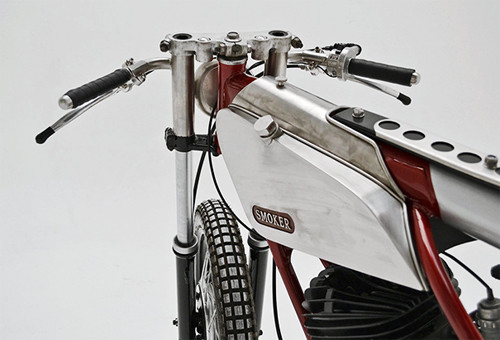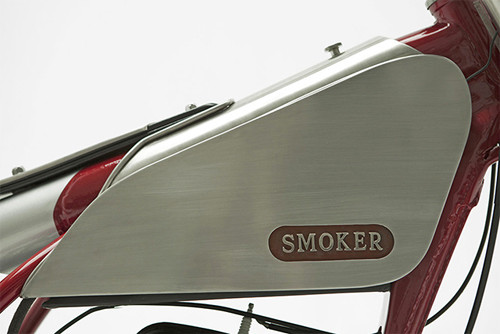 Chữ "Smoker" được cắt bằng laser ngay trên ốp bình xăng và sơn đỏ phần nền.