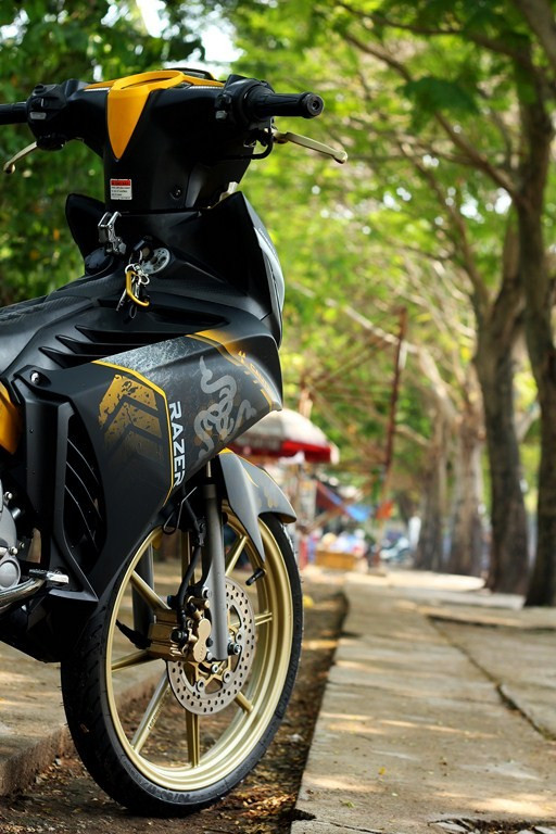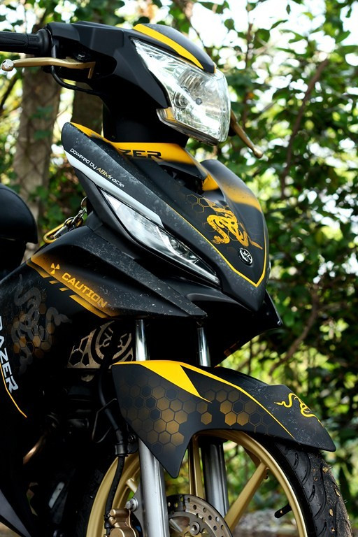 Có tên gọi Exciter Razer Exclusive, chiếc xe được trang trí lớp nhựa lấy cảm hứng từ game với hai màu chủ đạo vàng - đen cùng hiệu ứng bụi đá độc đáo.