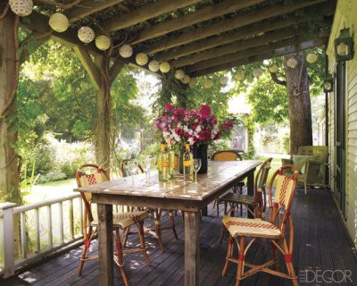 Không gian bên ngoài ngôi nhà, một góc thư giãn ngoài hiên. Bộ bàn ghế mây và gỗ thông của Pearl River.