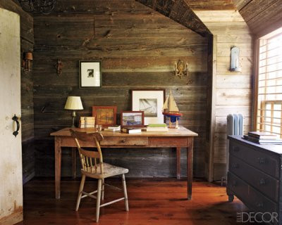 Một góc làm việc của chủ nhà trên tầng hai, tường và sàn nhà đều được làm từ gỗ
