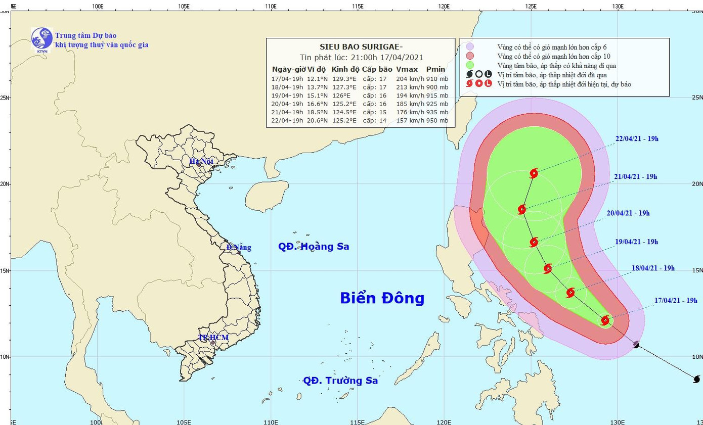 Theo tin từ Trung tâm Dự báo Khí tượng thủy văn Quốc gia, siêu bão SURIGAE đang hoạt động trên vùng biển phía Đông Philippines với sức gió cấp 17, giật trên cấp 17.