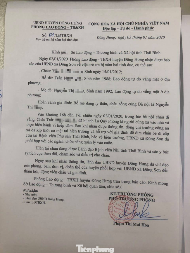 Cơ quan Cảnh sát điều tra Công an huyện Đông Hưng, tỉnh Thái Bình, vừa ra quyết định khởi tố vụ án, thực hiện lệnh bắt khẩn cấp và ra lệnh tạm giữ hình sự đối với Lã Quý Phóng (45 tuổi, đăng ký hộ khẩu thường trú tại thôn Bắc, xã Đông Sơn, huyện Đông Hưng, tỉnh Thái Bình) để điều tra hành vi phạm tội "Hiếp dâm người dưới 16 tuổi".