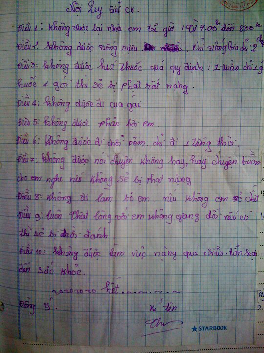 Để giữ chân “người yêu”, T. đã chủ động “soạn” ra “Nội quy giữ chồng” với 10 điều quy định mà ngay cả những phụ nữ đã có gia đình cũng… chào thua, như: Không được phản bội em; không được uống rượu, chỉ uống 2 chai bia thôi; không được lại nhà em trễ giờ; không đi làm bỏ em, nếu không em sẽ chết; không được làm việc nặng quá nhiều, tổn hại đến sức khỏe…