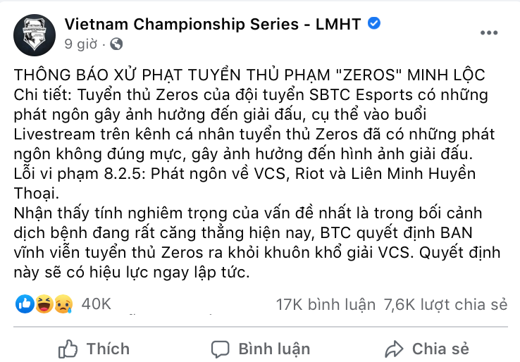 Nhận thấy tính nghiêm trọng của vấn đề nhất là trong bối cảnh dịch bệnh đang rất căng thẳng hiện nay, BTC quyết định BAN vĩnh viễn tuyển thủ Zeros ra khỏi khuôn khổ giải VCS. Quyết định này sẽ có hiệu lực ngay lập tức".