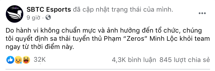 Sau khi ban tổ chức thông báo án phạt dành cho Zeros, fanpage của SBTC Esports cũng thông báo sa thải Zeros khỏi đội tuyển ngay lập tức.