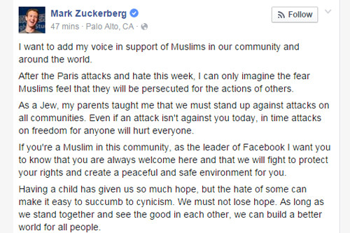 "Tôi muốn góp thêm tiếng nói của mình trong việc ủng hộ người Hồi giáo trên Facebook và trên toàn thế giới", Zuckerberg viết trên tài khoản của mình. "Sau vụ khủng bố ở Paris và sự căm ghét dâng cao của mọi người tuần này, tôi có thể hình dung nỗi sợ hãi mà người Hồi giáo đang cảm nhận, rằng họ phải chịu hậu quả vì hành động của những kẻ khác",